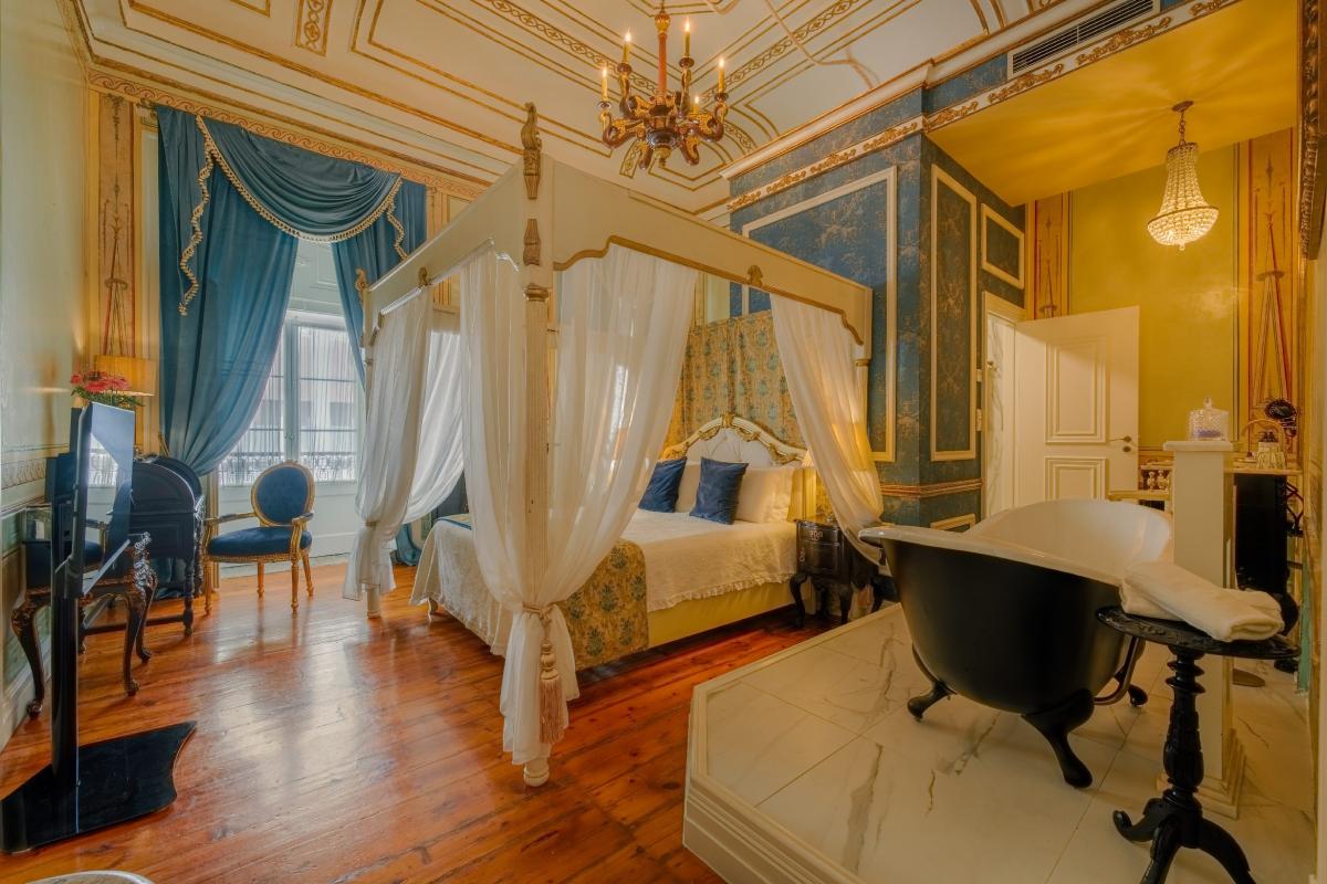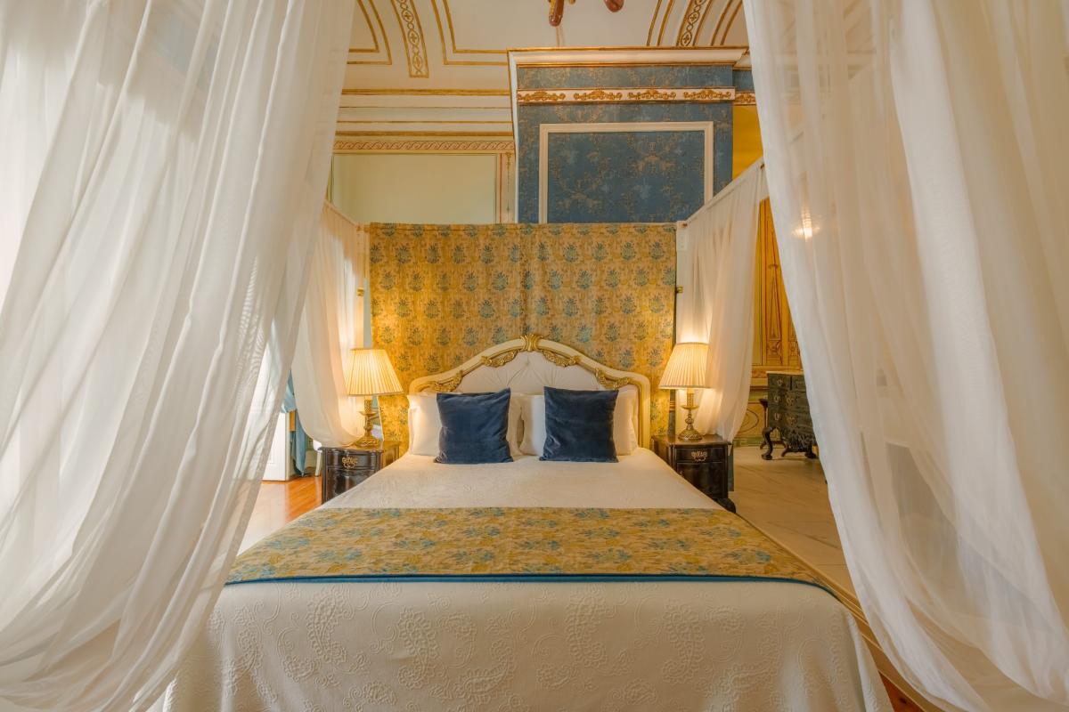 This luxurious suite presents a refined environment of pure comfort, conveying a feeling of exclusivity. The classic decor, with golden details and a clear canopy, creates a romantic and sophisticated atmosphere. The combination of polished wooden floors, lush blue curtains and soft cream and gold tones creates a serene atmosphere, perfect for relaxing. The elevated bathtub invites moments of pure relaxation. The small balconies add a visual connection to the outside, expanding the feeling of space and offering a city setting.