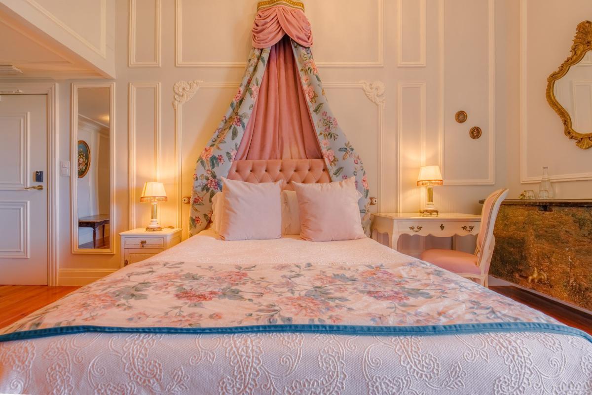 The decor mixes several classic elements with elegant furniture. The color palette of gold, burgundy and soft tones creates a feeling of warmth, sophistication and a touch of drama. The polished wooden floor and carved details on the furniture complement a highly refined and welcoming space. The small balcony invites you to enjoy pleasant contemplation of the city landscape, highlighting the charming neighboring gardens and the Tagus River as a backdrop.