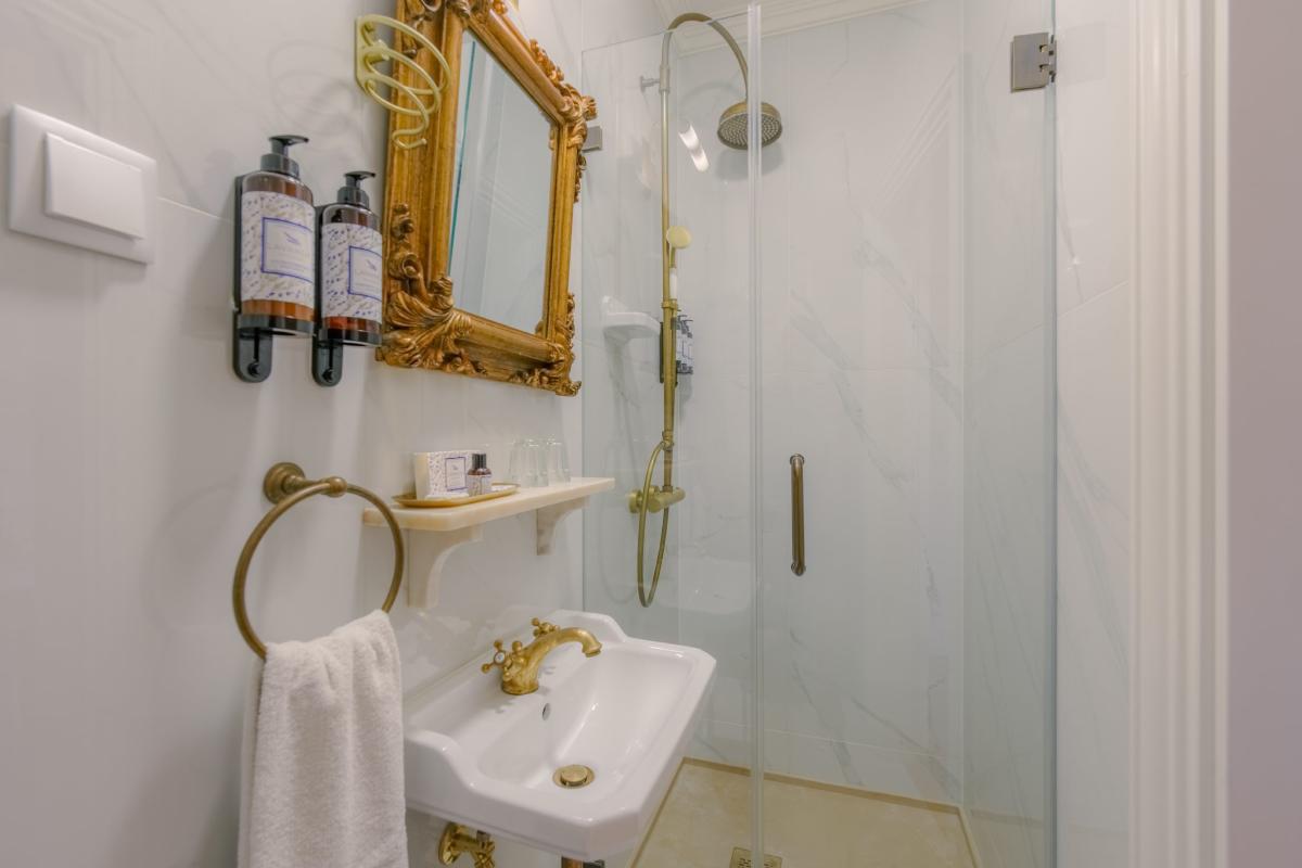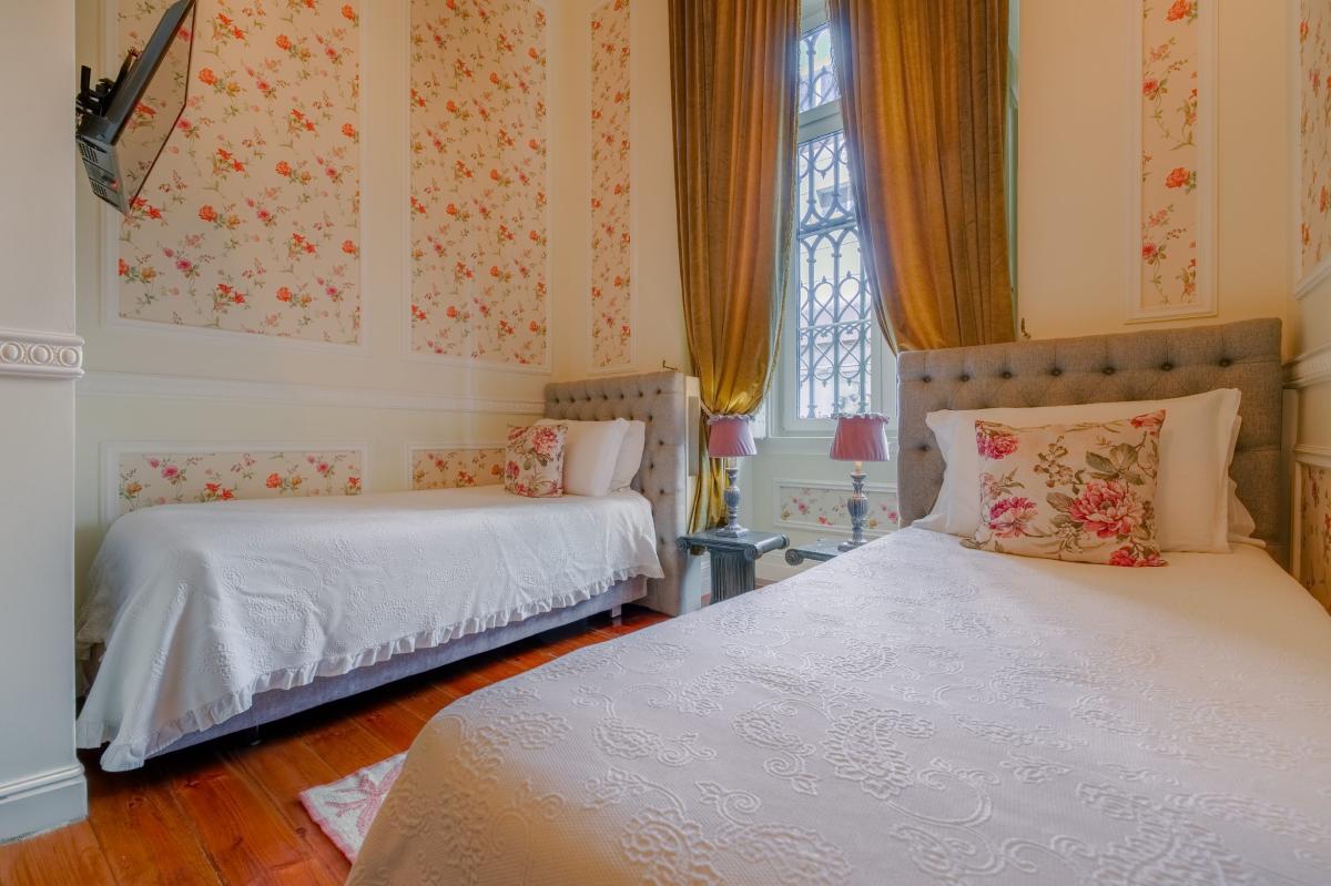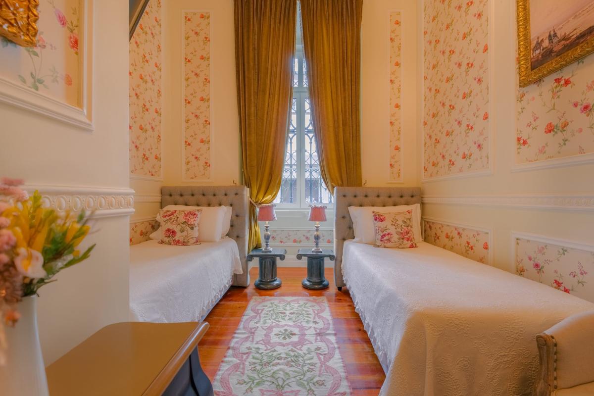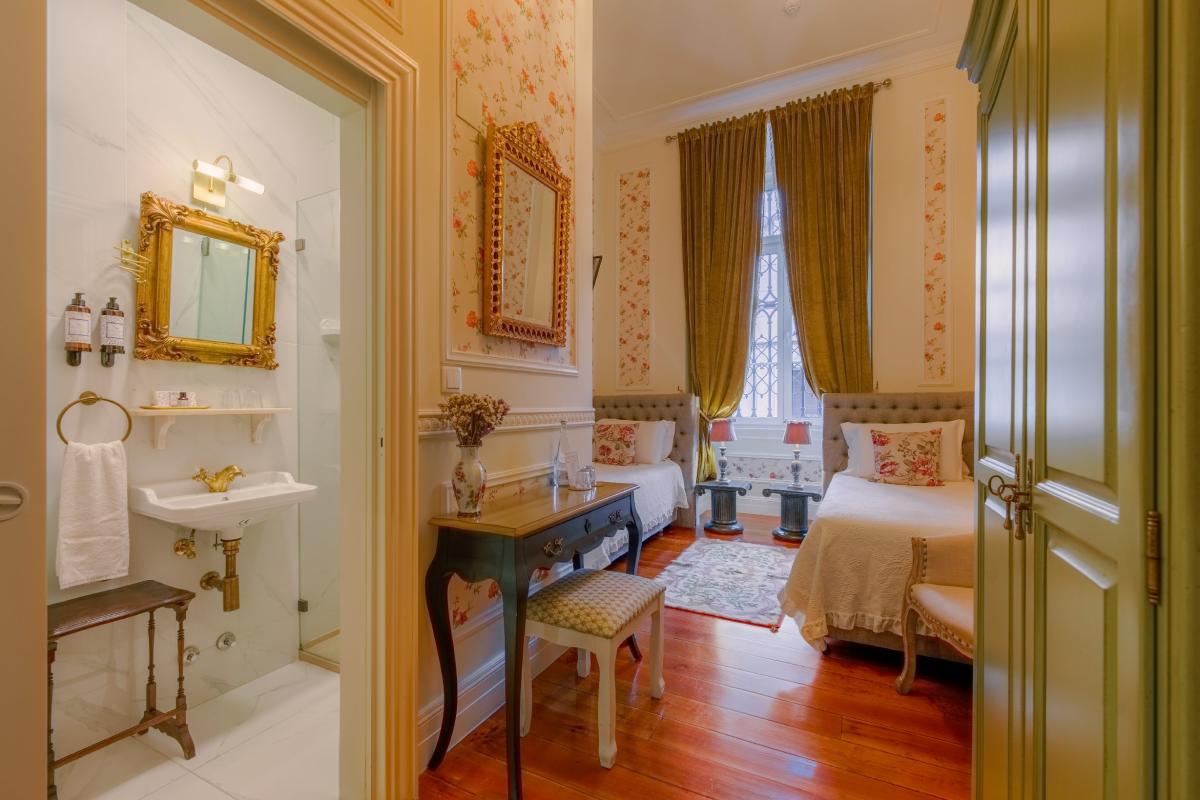 Trata-se de um quarto que nos transporta para a elegância doutras épocas, um lugar onde o requinte e o conforto vivem harmoniosamente.